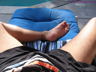 Well, in addition to the suspension event, I’ve included some pics of my tied in my lycra Spidey outfit. And, honor of the warm weather we’ve been having here in California, I thought I’d show a few “vanilla” pics of my feet poolside and wet. Enjoy, bois!