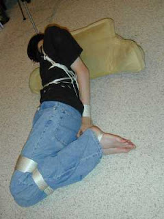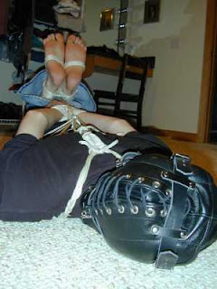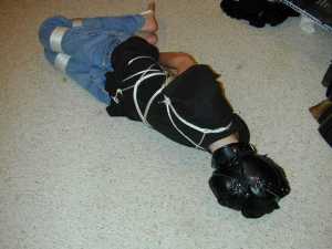 . I finished the hog-tie, forced a gag and a lightweight leather hood on him and told him the clock had started and it was now going to be 13 and a half hours before he was released. The extra hour and a half came as “punishment” for various comments he had made in our conversations (jokingly for sure). The extra 5 minutes was to make sure the full time was reached. The ropes all stayed on the entire time but the hood and gag came off and went back on occasionally. I made sure he was hydrated by giving him OJ through a straw and at one point he was given cake and ice cream. As for an “out” he did have one (I am not THAT cruel). At the time he sported some scruffy looking fuzz on his chin which he claimed was part of his “personality”and I told him that at any time he wanted to be untied all he had to do was let me shave it off. He completed the full time although he was a bit stiff when untied. Doing a tie like that to someone is actually more difficult on the top than on the victim. I had to stay right there with him and constantly monitor him to make sure he was OK. I wound up napping on the floor next to him and he managed some little naps too. Occasionally he would try to escape but it was obvious early on that he was not going to.