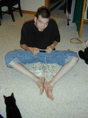Daemon and I had been chatting and talking on the phone and he mentioned something about long term bondage – either he or someone had been hog tied for several hours – and he mentioned he wanted to be hog tied for 12 hours. It was occasionally mentioned in conversations after that and when he next visited me (for several days) we did a lot of tying. He got tied every which way and was enjoying them. One day I was putting him into a nice secure but comfortable hog-tie and had him pretty well all roped up – wrists, arms, ankles, knees all tied and I was putting the finishing touch on the ropes – the feet pulled up to the hands. As I was pulling them up close I calmly mentioned to him “Remember that 12 hour hog-tie you wanted?”. His reaction was immediate and so much fun – instant struggling