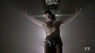 American Horror Story has been quite catering to us kinks. Evan Peters shirtless and soon to be strapped down, and a great shot of his arching foot. Followed by a semi-unpleasant but still kinda hot pic of Ralph Fines.