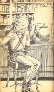 There were many themes: adventure stories, sci-fi, haunted houses, and even a mystery. In the book The Mystery of Harlowe Thromby, at one point, if you choose carefully, your character got tied up. And amazingly enough, they were generous enough to provide a full page illustration of how thoroughly you got bound with a towel wrapped around your head.