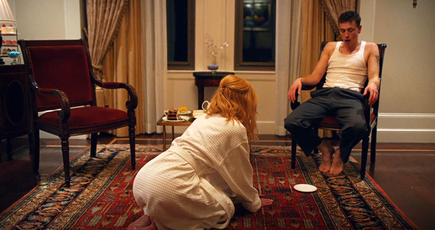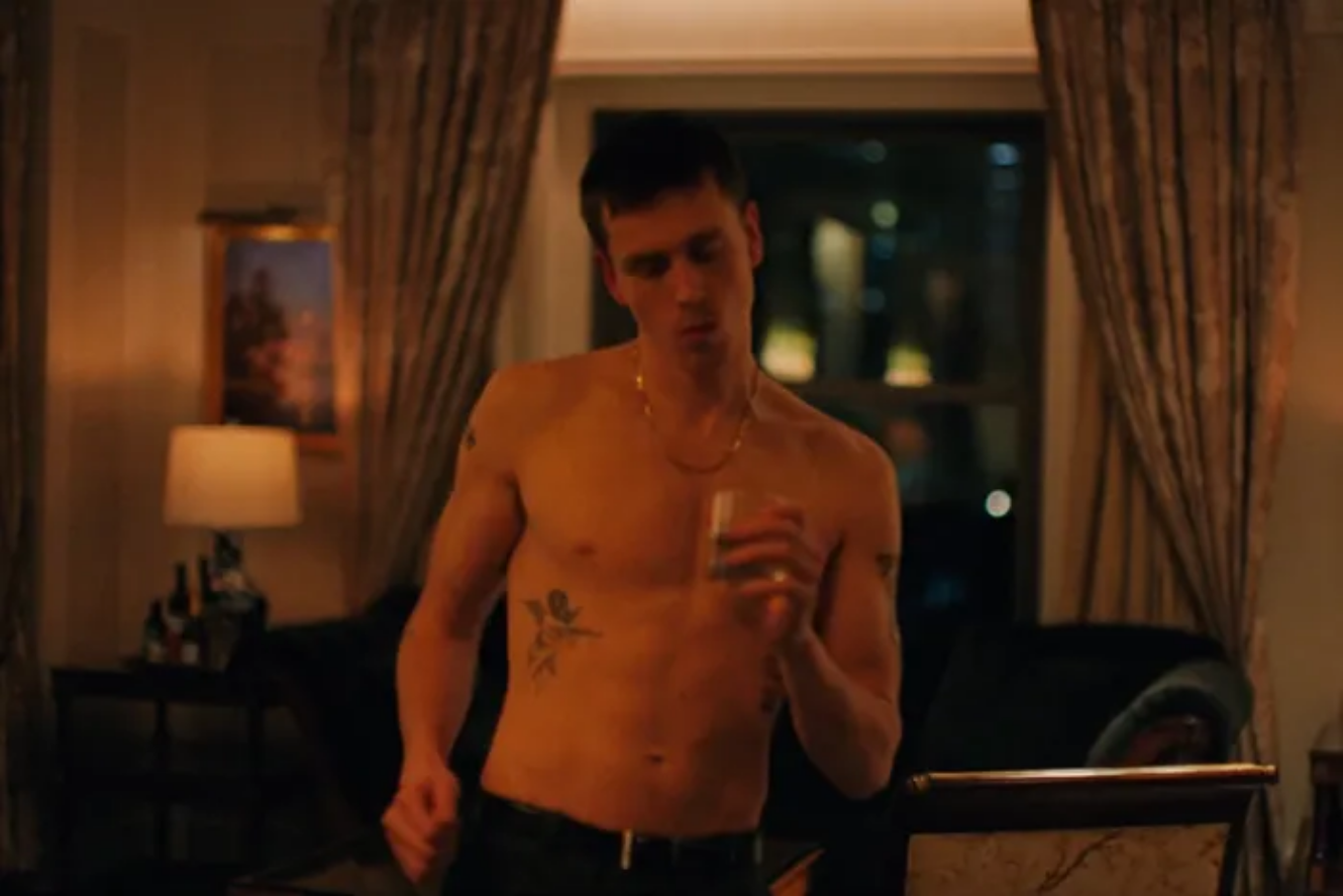 In terms of eye candy with Harris Dickinson, there’s a few shirtless scenes, and he’s barefoot for a scant few scenes (no sole shots aside from walking). And all the scenes are towards the final 1/3 of the film.