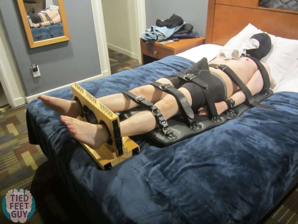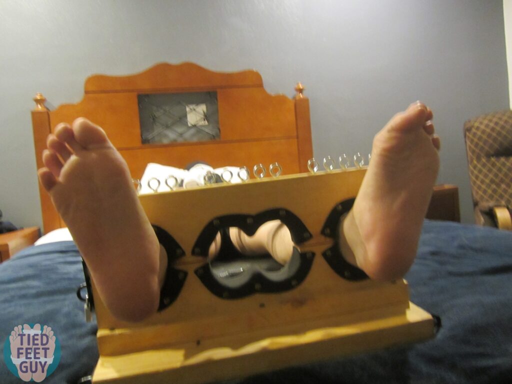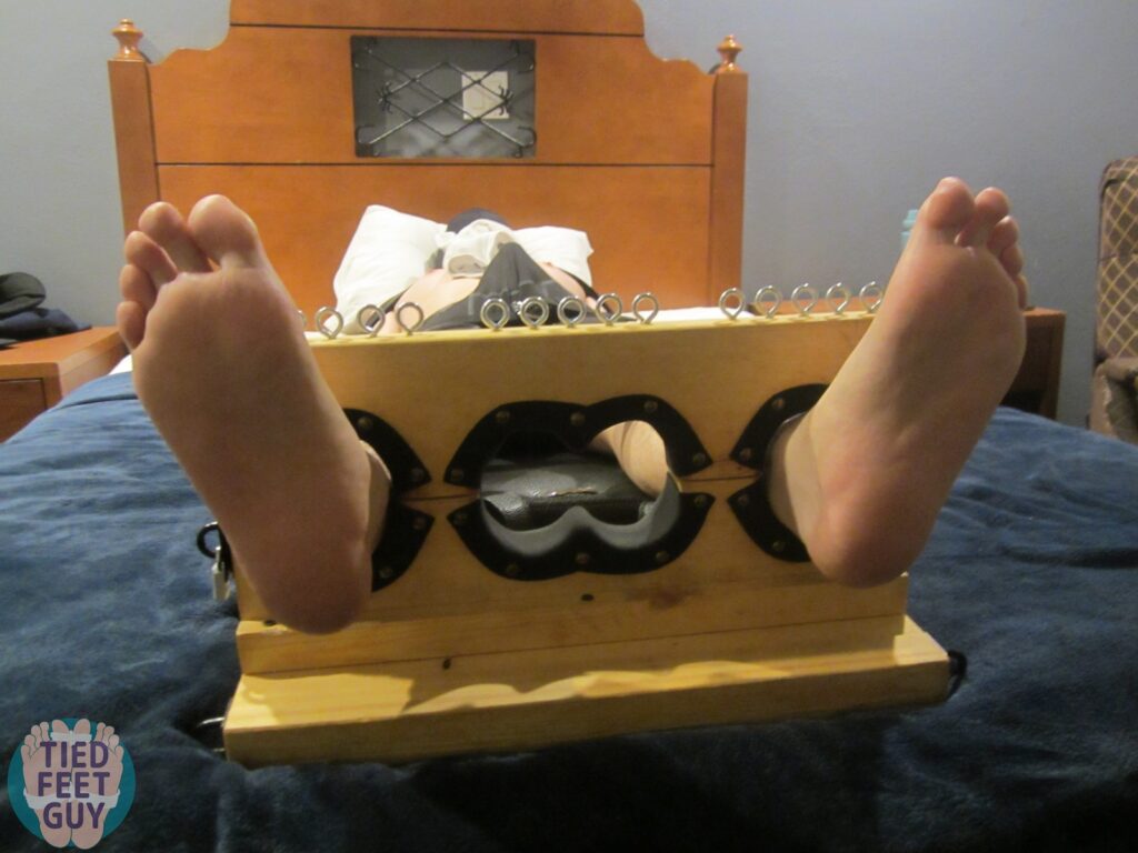 We continue with some close ups of his helpless upper body, which endured a great deal of tickling. That was followed by getting strapped down to my bondage board and foot stocks for even more tickling and teasing. Look at that hard dick tenting mid-way through this post! And his feet smelled amazing.