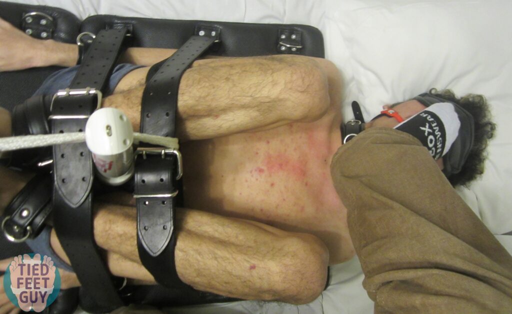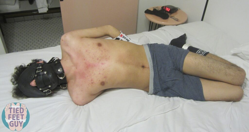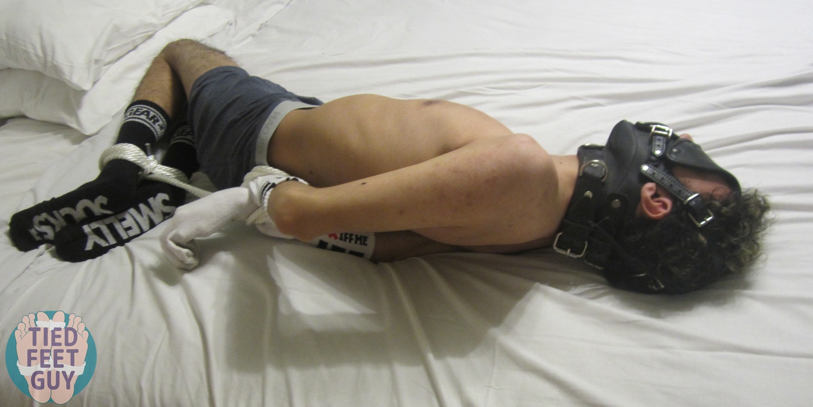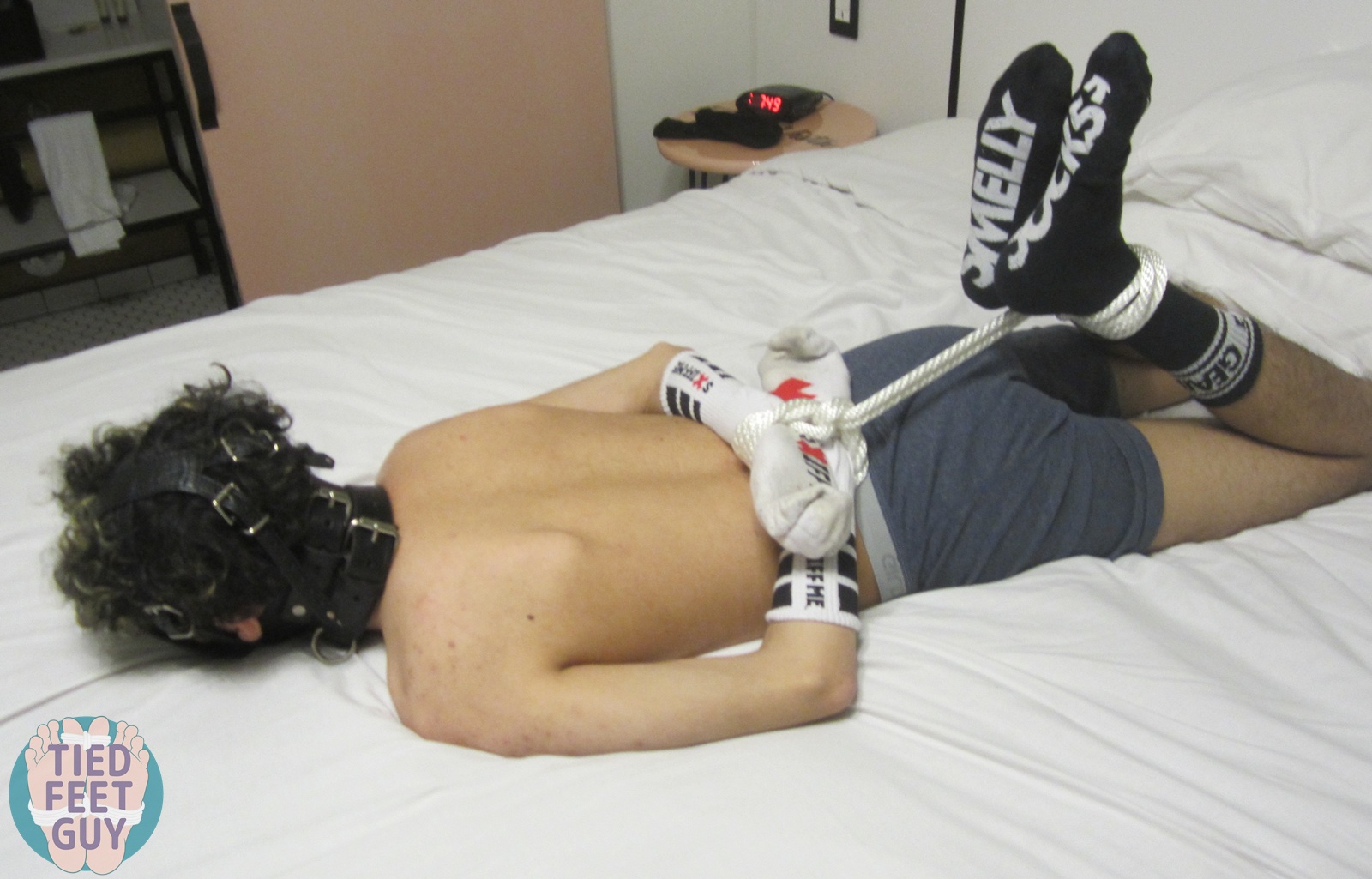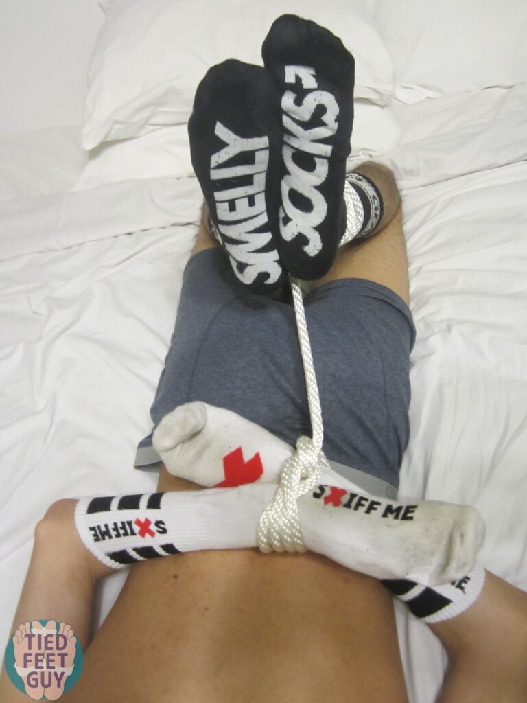 Final set! But a larger post with a variety of positions. Face up on my bondage board, followed by face down, and then my favorite, hogtied with my smelly socks on his hands and feet.