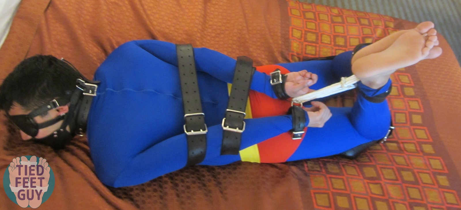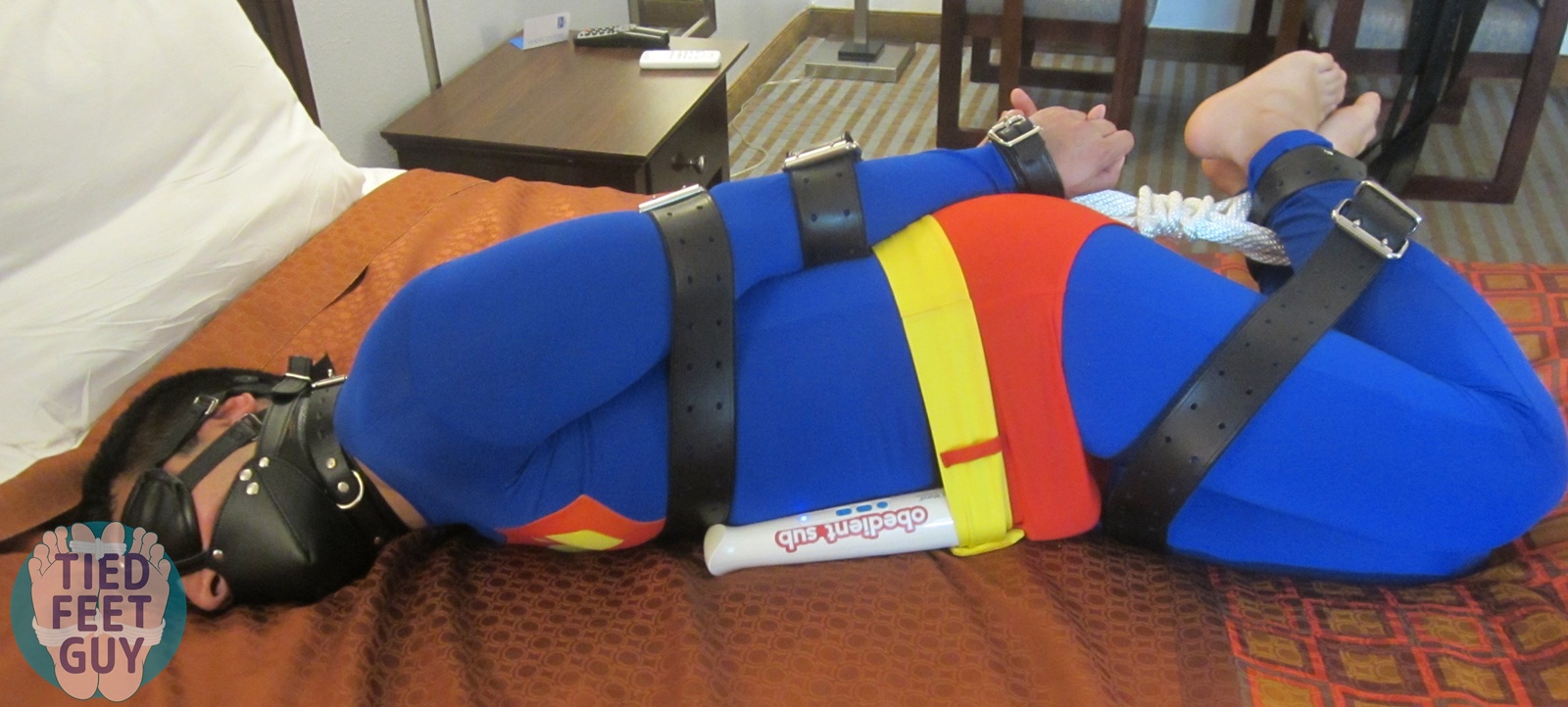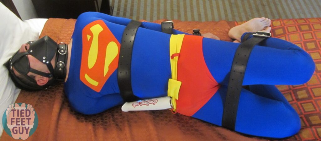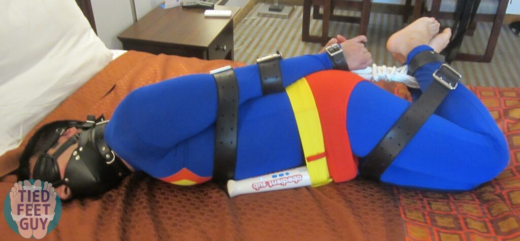 More of him muzzled, barefoot, and belted in a hogtie in Superman lycra. Indulged in his helpless feet for a bit, stepped on his face with mine, and relentlessly edged him with my magic wand. He was really moaning a lot…