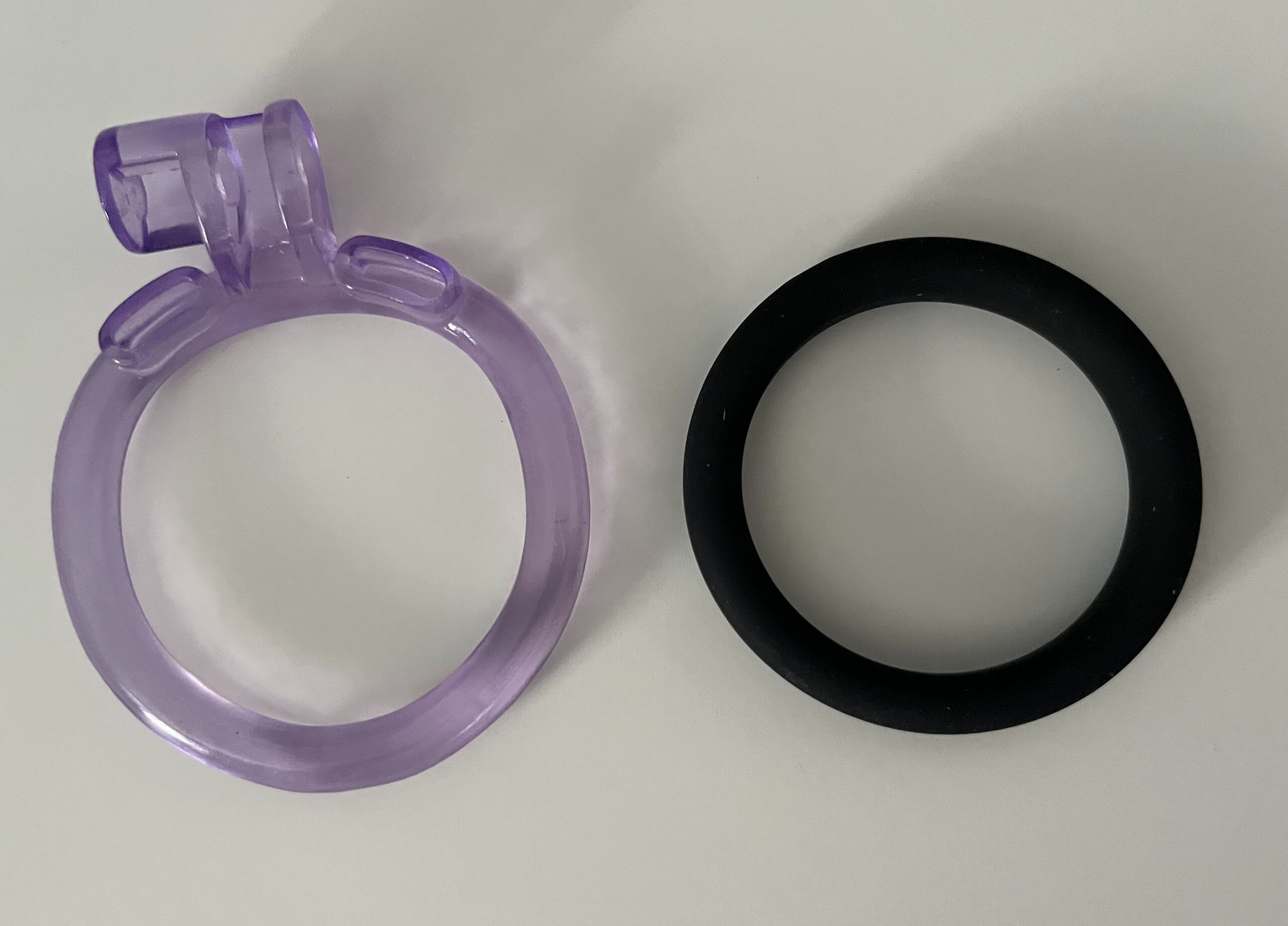 But I did suddenly think: what if I used one as a sort of “second” ring to trap my balls a bit further? And you know what? So far, it’s been totally successful. I have the comfort of the Ice Cage, but I haven’t yet slipped out. I choose a silicone ring that is essentially the same size as the chastity ring, and layer them on top of each other. And when putting the cage on, I just pretend it’s one big ring, slipping both my cock and balls though both. I place it just below where the two pieces lock together.