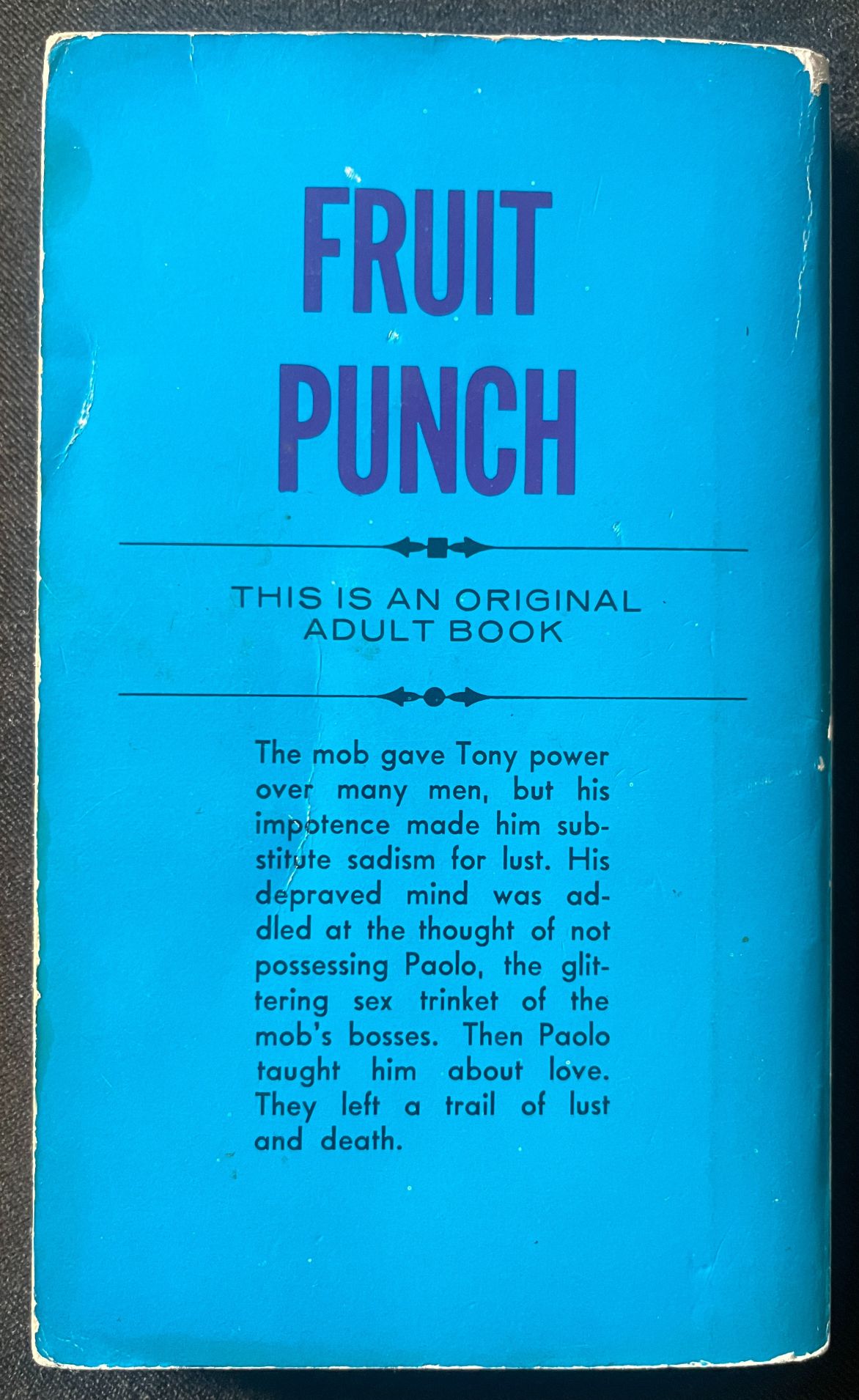 I enjoy collecting gay pulp books, and this cover is a classic. And it’s even better when I get to read them. While the front cover is well circulated, the back cover isn’t as known, and it’s quite the synopsis–and when you read it, the book has an ending that is a serious shocker!
