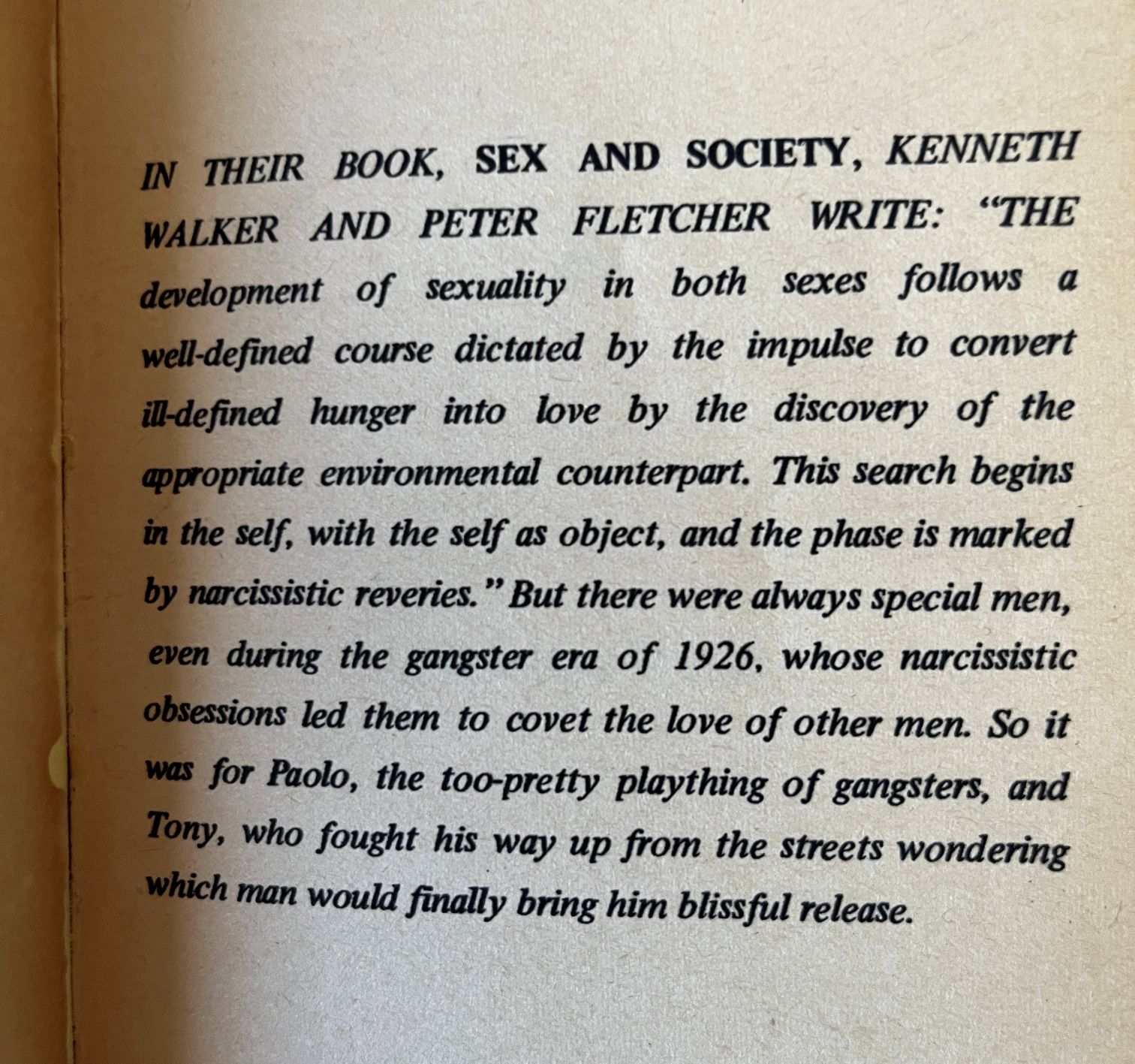 The book begins with a Tony, the muscle of a mobster gang in 1926, initiating two young male members by forcing them to be naked and have sex with each other. Quite explicitly. While he’d like to be turned on, he’s frustrated by his own impotence, and sometimes puts guys in very extreme situations… at one point, he ties the two men up naked, attaches a wire to their genitals, and is about to apply electricity, when he’s interrupted by the head guy, Leo. Apparently, in this gang, all the men like to have sex with each other, but this time, Leo also has some mob business to attend to, and he needs Tony to accompany him in picking up a very hot headed young man from Italy, Paulo.