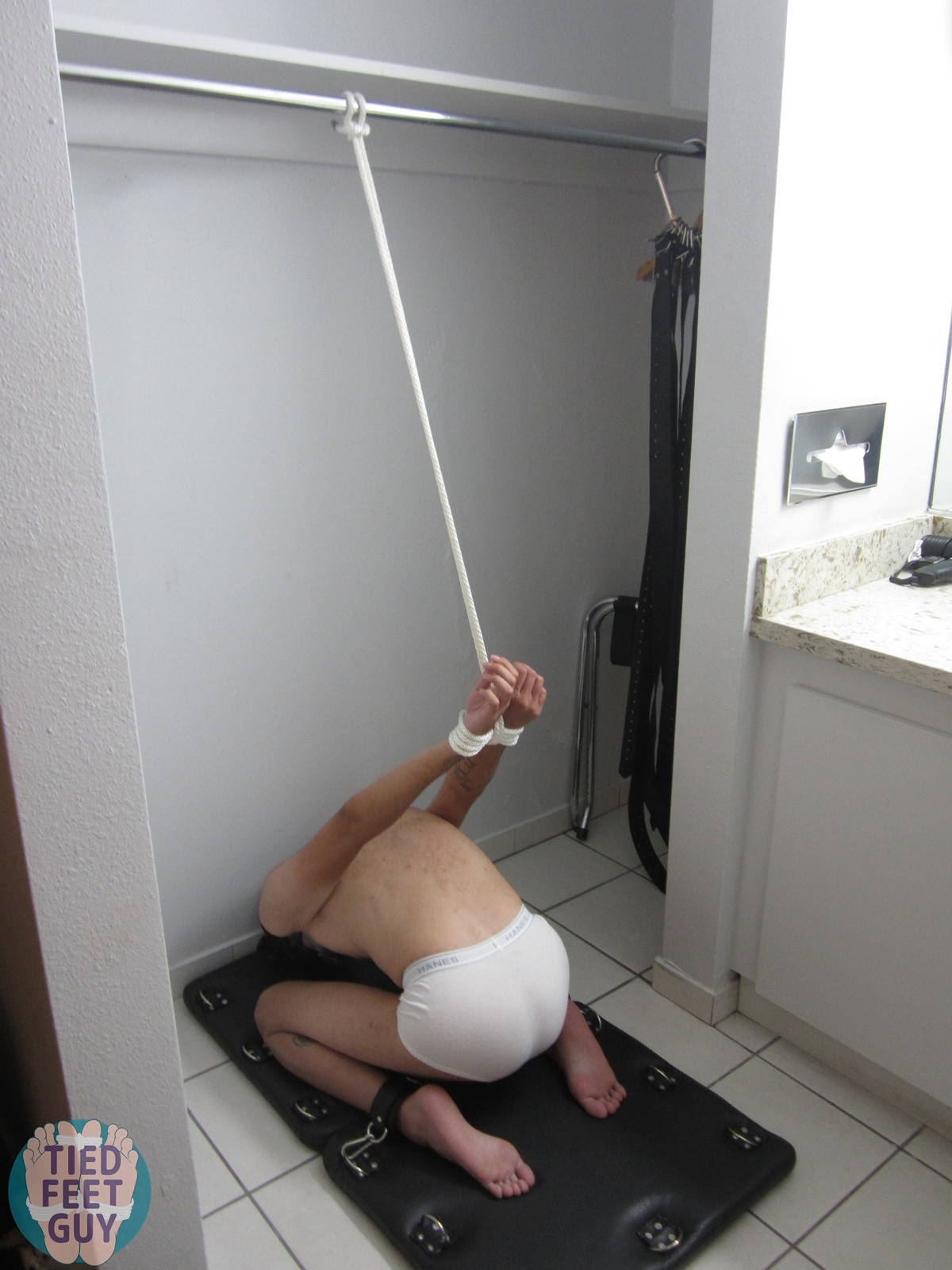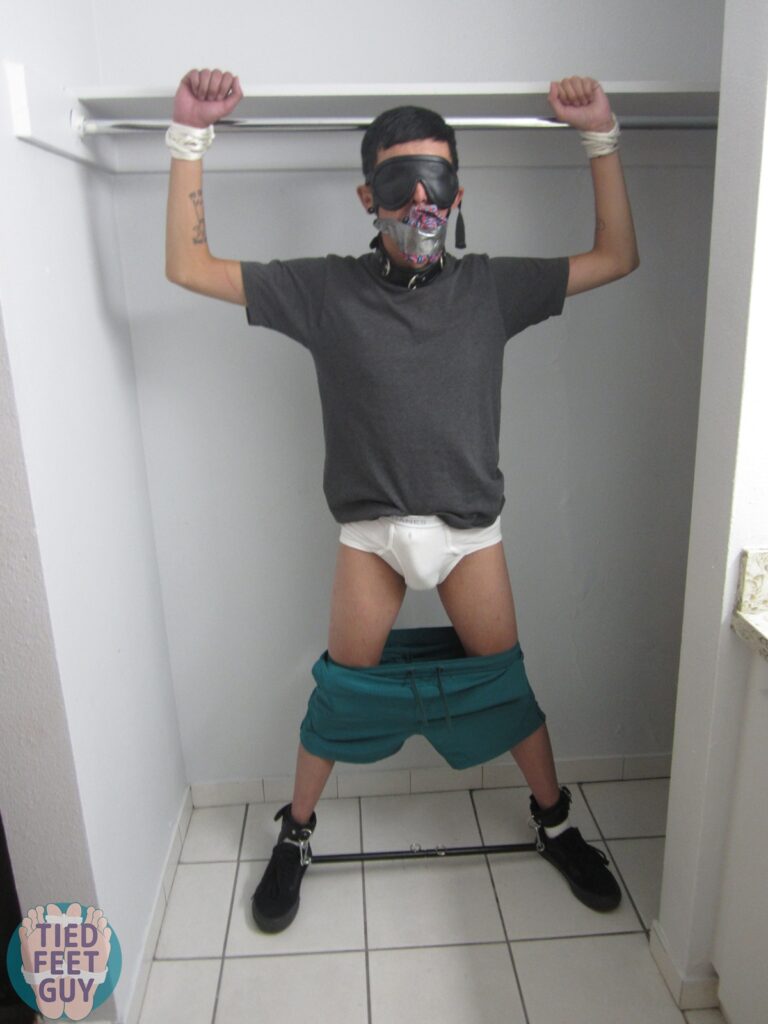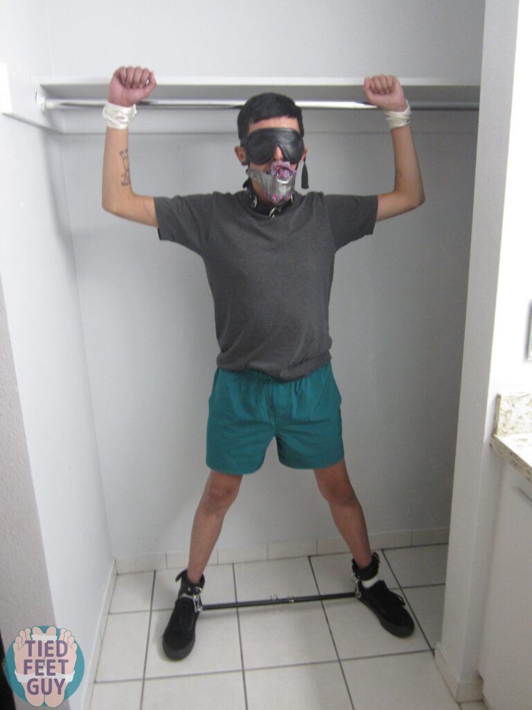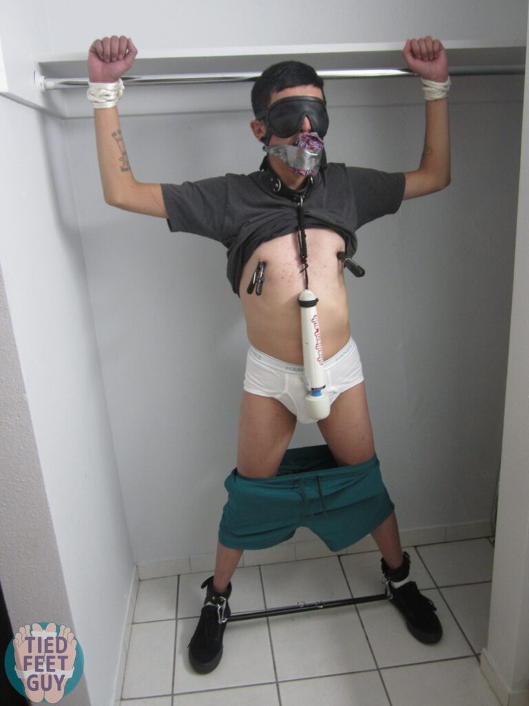 Two poses for one in this post! First, tied him standing up, and dangled a Magic Wand off his collar right onto his crotch. Quite a bit of moaning with that one!