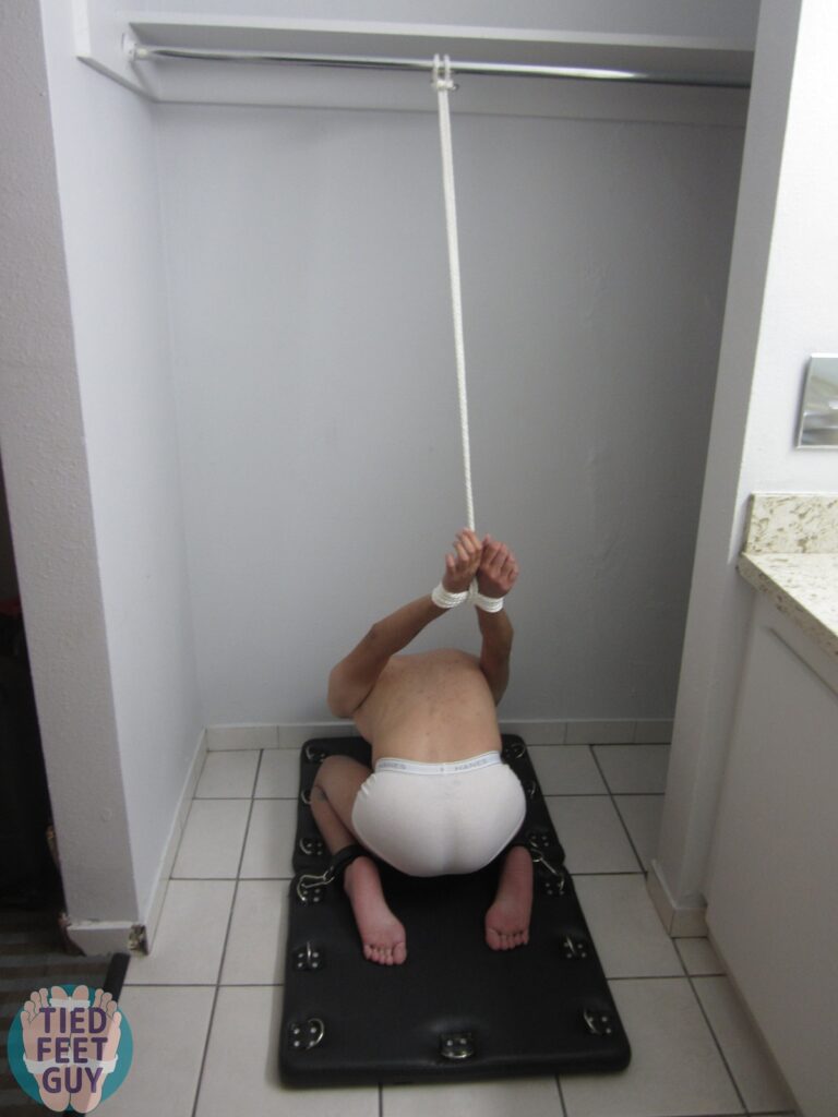 Next up, I put him on my bondage board in a strappo-type position. He took it like a champ, he said he liked it! Also gave me some very sexy feet views. Later I teased him in this awkward position with the Magic Wand again. It really makes people moan and squirm!