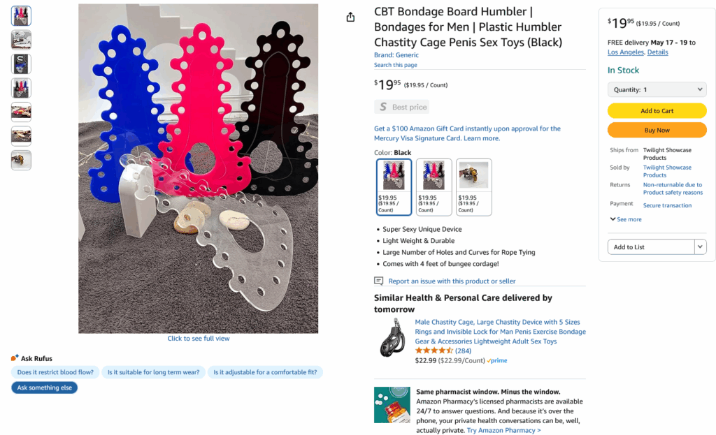 The same device is sold on a website called “BDSM Showcase”, but I do get a virus warning when I try to visit it. That said, when I ordered it on Amazon, it arrived without any problems–aside from the fact I found out the hard way they cannot do rushed shipping… they need at least a week to prepare and ship it. So if you try to do overnight or 2 day shipping, they will cancel the order on their end.
